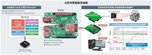 這次開發(fā)出的設(shè)備端學(xué)習(xí)AI芯片原型(產(chǎn)品型號:BD15035)在人工智能技術(shù)的基礎(chǔ)上,采用了慶應(yīng)義塾大學(xué)松谷教授開發(fā)的“設(shè)備端學(xué)習(xí)算法(三層神經(jīng)網(wǎng)絡(luò)*4的AI電路)”。為了推出可以投放市場的產(chǎn)品,ROHM將這種AI電路的大小從500萬門縮小為2萬門,僅為原來的0.4%,并將其重新構(gòu)建為自有的AI加速器“AxlCORE-ODL”,同時,利用ROHM的8位高效微處理器“tinyMicon MatisseCORE™”進(jìn)行AI加速器的運(yùn)算控制,使得僅數(shù)十毫瓦的超低功耗AI訓(xùn)練和推理成為可能。利用本產(chǎn)品,無需連接云服務(wù)器和事先進(jìn)行AI訓(xùn)練,就可以設(shè)備終端將未知的輸入數(shù)據(jù)和模式(例如加速度、電流、照度、聲音等)形成“不同于以往(異常度)”的數(shù)值并輸出,因此不僅可以降低云服務(wù)器和通信成本,還能通過終端AI進(jìn)行實時故障預(yù)測(故障跡象檢測)。