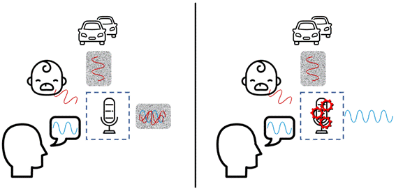 麥克風(fēng)會(huì)捕捉這兩種類型的噪音;在不做任何處理的情況下,會(huì)產(chǎn)生同樣嘈雜的輸出,蓋過你期望傳遞的語音信息。圖的左半部分顯示了這種情況。但是,通過噪音抑制處理,可以消除背景噪音以便傳輸(而且僅傳輸)你的聲音。