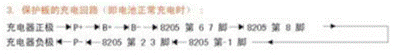 當(dāng)電芯電壓在2.5V至4.3V之間時,DW01 的第1腳、第3腳均輸出高電平(等于供電電壓),第二腳電壓為0V。此時DW01 的第1腳 、第3腳電壓將分別加到8205A的第5、4腳,8205A內(nèi)的兩個電子開關(guān)因其G極接到來自DW01 的電壓,故均處于導(dǎo)通狀態(tài),即兩個電子開關(guān)均處于開狀態(tài)。此時電芯的負極與保護板的P-端相當(dāng)于直接連通,保護板有電壓輸出。