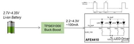 首先,TPS631000的基本參數(shù)(TPS631000數(shù)據(jù)表)可以滿足該應(yīng)用的需求,當輸入電壓近似等于輸出電壓時,TPS631000 會自動以升壓、降壓或 3 周期降壓/升壓模式運行。它還能夠以定義的占空比進行模式切換,避免不必要的模式內(nèi)切換,以減少輸出電壓紋波。生物傳感模塊一般不會持續(xù)工作,多數(shù)設(shè)計是間隔一定時間運行一次,因此,大部分時間該模塊會處于待機狀態(tài),TPS631000的靜態(tài)電流僅為8 µA,因此可在輕載條件下實現(xiàn)出色效率,最大限度減少不必要的電能損耗以延長待機時間。此外,TPS631000提供小尺寸解決方案,采用 1.2mm × 2.1mm SOT-583 封裝、一個 1µH 電感器和一個 0805 輸出電容器,方便開發(fā)者實現(xiàn)小型化設(shè)計。
