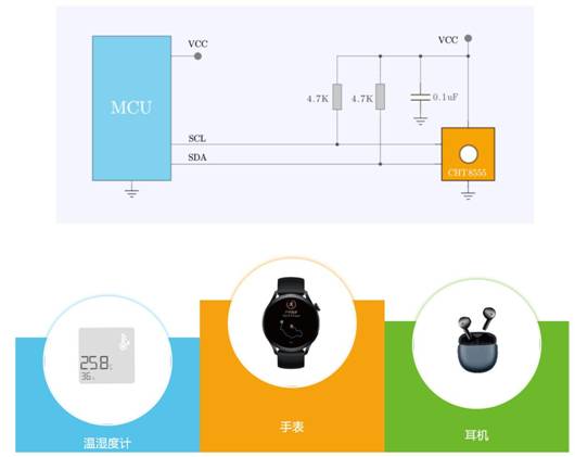 CHT8555在用戶使用時(shí)無需再次校準(zhǔn),即可保證20~50℃溫度范圍內(nèi)小于±0.1℃的誤差,-40~125℃溫度范圍內(nèi)小于±1.0℃的誤差,20~80%RH濕度范圍內(nèi)小于±3.0%RH的誤差。具有富有競(jìng)爭(zhēng)力的低工作電流,小芯片級(jí)CSP封裝以及低功耗,專為空間有限的產(chǎn)品應(yīng)用所設(shè)計(jì),可廣泛應(yīng)用于便攜式TWS耳機(jī)、手表、手環(huán)等智能穿戴設(shè)備,同樣適用于IoT智能家居、環(huán)境監(jiān)測(cè)器及安防攝像頭等領(lǐng)域。