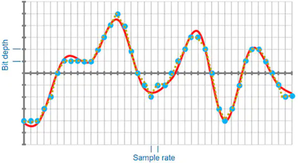 在現(xiàn)實世界中,聲音是一種模擬信號,但我們的錄音和回放設(shè)備主要處理的是數(shù)字信號。聲音通過一個模數(shù)轉(zhuǎn)換器 (ADC) 進行數(shù)字化,而轉(zhuǎn)換器由一個編碼/解碼(“編解碼器”)算法驅(qū)動,這個算法則控制著赫茲 (Hz) 采樣率和比特深度(比特數(shù))。采樣以特定時間間隔捕捉聲音的模擬波形振幅。