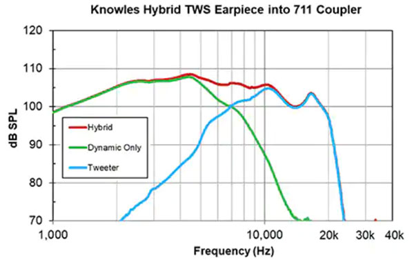 圖4:將揚聲器系統(tǒng)分成動態(tài)低音單元(綠色)和 BA 高音單元(藍色)產(chǎn)生了平坦的頻率“混合”響應(yīng)(紅色)(圖片來源:Knowles)