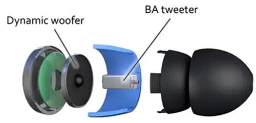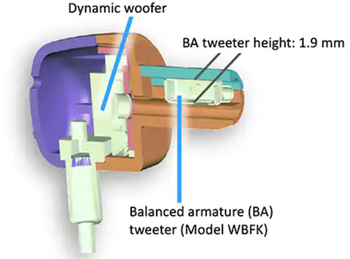解決辦法是將低音和高音頻率分給一個動態(tài)低音單元和一個獨立的平衡電樞 (BA) 高音單元。BA 高音單元是一種專用組件,最初是為助聽器應(yīng)用而開發(fā)的,現(xiàn)在越來越多地被用于提升高品質(zhì)耳塞的高音響應(yīng)。在 BA 高音單元中,電子信號會振動一個微小的簧片,平衡緊湊外殼內(nèi)的兩個磁鐵;善倪\動被轉(zhuǎn)移到一個非常堅硬的鋁制振膜上,從而產(chǎn)生聲音。