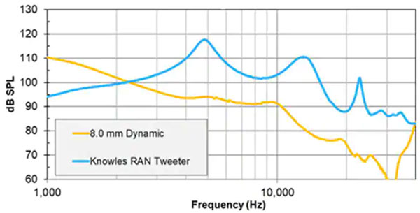 圖 7:圖中所示為 Knowles 的 BA 高音單元與動態(tài)揚聲器的高頻響應(yīng)比較。(圖片來源:Knowles)