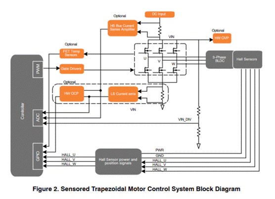 有傳感器式梯形控制不需要任何電壓或電流反饋信號即可運行。它使用來自霍爾傳感器的位置反饋來確定為電機各相位通電的正確順序。安裝在電機上的霍爾傳感器通過轉子永磁體旋轉磁場產生的霍爾效應來感測轉子位置。即使在啟動時,也可以進行適當的換向,因為即使在零速下,轉子位置信息也存在。