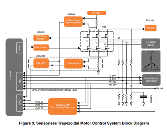 圖3:無傳感器的電機梯形控制系統(tǒng)框圖