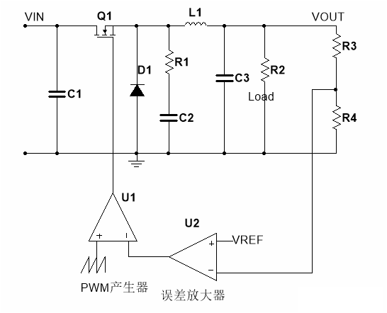 普通的buck變化器結(jié)構(gòu)如圖所示,VIN為DC輸入電壓,C1為輸入電容,Q1為MOSFET開關(guān),D1為buck結(jié)構(gòu)中必須的二極管,在同步降壓芯片中D1也是MOSFET,可以提高效率和降低成本。R1,C1不是必須的,RC吸收電路能提高EMI性能。L1為儲能電感,C3為輸出電容,R3,R4,U2,U1組成反饋環(huán)路,R3和R4設(shè)定輸出電壓。