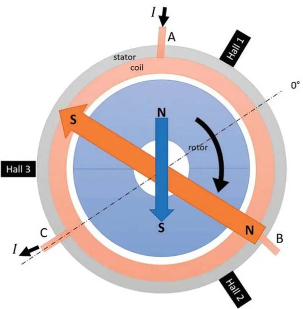 圖 2 :無槽無刷直流電機的橫截面示意圖。藍色 區(qū)域是帶有兩極永磁體的轉(zhuǎn)子。磁鐵產(chǎn)生的磁場 由藍色箭頭表示。橙色區(qū)域為三相繞組。當電流 從 A 相流向 C 相時會產(chǎn)生磁場,由橙色箭頭表 示,以便于簡化。當兩個箭頭對齊時,轉(zhuǎn)子將旋 轉(zhuǎn)。驅(qū)動器變換相位(旋轉(zhuǎn)定子磁場,橙色箭頭), 以確保定子和轉(zhuǎn)子磁場之間盡可能保持 90 度(產(chǎn) 生最大扭矩)。