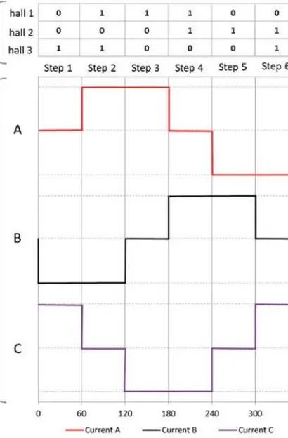 圖 3 :六步換向相電流和霍爾傳感器狀態(tài)。