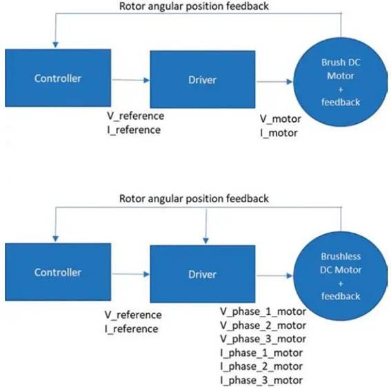 圖 5:有刷直流電機和無刷直流電機之間的運動控制架構(gòu)比較。