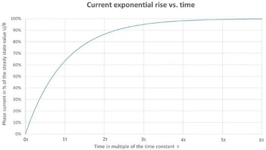 現(xiàn)在,為了簡單起見,我們不考慮反電動勢。當向R L 電路施加電壓或切斷電壓時,電感器將阻止電流的變化。向R L 電路施加電壓U,電流將遵循一階指數(shù)上升,其動態(tài)取決于由L / R 比決定的電時間常數(shù)τ(圖9)。在經(jīng)過5 倍時間常數(shù)后,它將逐漸達到穩(wěn)態(tài)值,即99.7%的U/R。