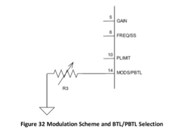 3. pin14 AD52090 pin14(PBTL)用來(lái)設(shè)置雙聲道(BTL)以及單聲道(PBTL)工作模式。 低電平:雙聲道(BTL); 高電平:?jiǎn)温暤溃≒BTL) ACM3128A pin14(MODS/PBTL)用來(lái)設(shè)置調(diào)制模式以及雙聲道(BTL)以及單聲道(PBTL)工 作模式。接一個(gè)電阻到地,不同電阻對(duì)應(yīng)四個(gè)模式。