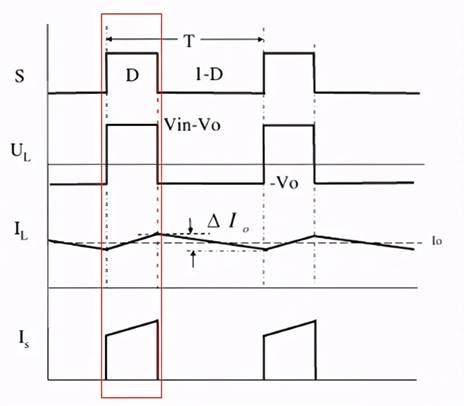 當(dāng)開(kāi)關(guān)導(dǎo)通時(shí):輸入電壓Vin加到LC濾波器的輸入端,電感上的電流以固定斜率線性上升。如下圖