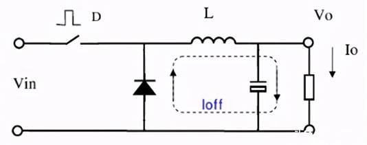 當(dāng)開(kāi)關(guān)關(guān)斷時(shí):由于電感上的電流不能突變,電感中存儲(chǔ)的能量向負(fù)載釋放,電感電流通過(guò)二極管續(xù)流 ,在這個(gè)階段,電流波形是一條斜率為負(fù)的斜線。如下圖