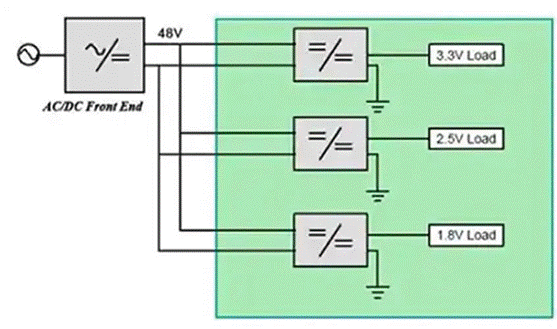 所有類型電子系統(tǒng)對效率要求的都越來越高,而且復(fù)雜性也在不斷提高,這就促使電源系統(tǒng)架構(gòu)和電源轉(zhuǎn)換拓?fù)湟苍谙鄳?yīng)地向前發(fā)展。隨著越來越多的獨(dú)立電壓域能夠支持日益增多的功能,分布式電源架構(gòu) (DPA) 在愈來愈多的電子系統(tǒng)中得到了應(yīng)用。DPA并沒有采用多個隔離電源來驅(qū)動不同的負(fù)載,而是僅包含一個用于產(chǎn)生相對較高配電電圧的隔離式AC/DC電源,以及多個較小的降壓轉(zhuǎn)換器。其中,降壓轉(zhuǎn)換器用于根據(jù)每個負(fù)載的要求,將配電電壓將至較低的水平(圖1)。采用多路降壓轉(zhuǎn)換器的優(yōu)勢在于體積小、效率高、性能優(yōu)。