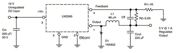 典型的異步降壓轉(zhuǎn)換器應(yīng)用如圖2所示。ON Semiconductor的LM2595是一款單片集成電路,包括主電源開關(guān)和控制電路。該器件采用內(nèi)部補(bǔ)償,最大限度地減少了外部元器件的數(shù)量并簡化了電源設(shè)計(jì)。其典型轉(zhuǎn)換效率為81%,發(fā)熱損耗為占功率的19%,而同步降壓方案的典型轉(zhuǎn)換效率約90%,發(fā)熱損耗僅占功率的10%。這意味著異步降壓轉(zhuǎn)換器的熱損耗幾乎是同步降壓轉(zhuǎn)換器的兩倍。因此,使用同步降壓轉(zhuǎn)換器可以減少發(fā)熱,從而大大簡化熱管理難題。