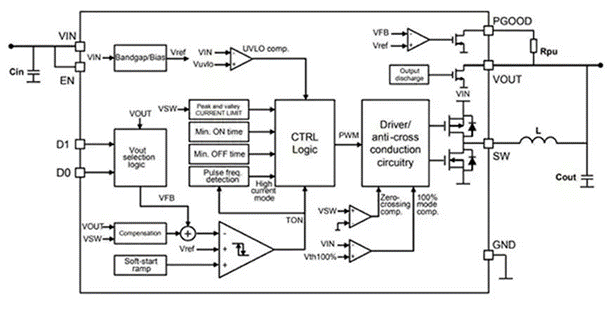 圖4:同步降壓轉(zhuǎn)換器IC框圖顯示了兩個集成MOSFET(旁邊標(biāo)有“SW”的引腳)和增加的驅(qū)動器/防交叉導(dǎo)通電路。(圖片來源:STMicroelectronics)
