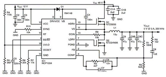 ON Semiconductor的NCP1034DR2G是一款高壓PWM控制器,針對輸入電壓高達(dá)100伏的高性能同步降壓DC/DC應(yīng)用。該器件設(shè)計(jì)用于嵌入式電信、網(wǎng)絡(luò)和計(jì)算應(yīng)用中的48伏非隔離電源轉(zhuǎn)換。NCP1034驅(qū)動一對外部N溝道MOSFET,如圖7所示。