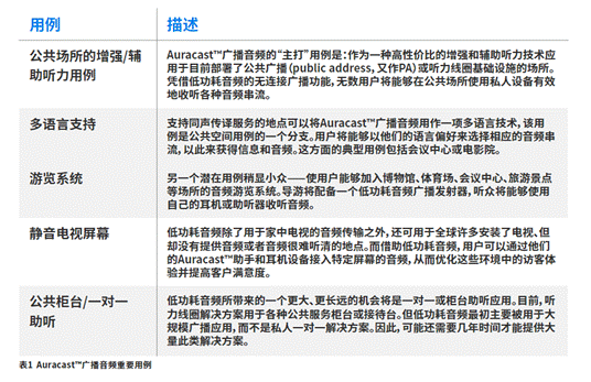 如下面的表1所示,藍(lán)牙技術(shù)聯(lián)盟確定了五個主要的初始Auracast™廣播音頻用例。隨著市場的發(fā)展和Auracast™廣播音頻設(shè)備安裝量的增加,市場上很可能會出現(xiàn)其他具有吸引力的新用例。