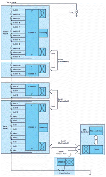 圖1中的拓?fù)浒ㄒ粋(gè)EV電池組監(jiān)視器(在本例中為ADI公司的LTC2949),用于低側(cè)電流檢測配置,其中isoSPI通信線路與底部電池監(jiān)視器(LTC6811-1)并聯(lián)。為了增強(qiáng)可靠性,可以通過將第二個(gè)isoSPI收發(fā)器連接到電池組頂部并創(chuàng)建可在兩個(gè)方向上通信的環(huán)形拓?fù)鋪韺?shí)現(xiàn)雙通信方案。與 SPI 主控制器的隔離通信通過一個(gè)LTC6820isoSPI 至 SPI 信號轉(zhuǎn)換器實(shí)現(xiàn)。ADI公司的可堆疊LTC681x系列多節(jié)電池監(jiān)視器可用于測量多達(dá)6、12、15或18節(jié)串聯(lián)電池的單個(gè)電壓,而單個(gè)LTC2949則用于測量總電池組參數(shù)。LTC681x 和 LTC2949 共同構(gòu)成了一個(gè)全面的 EV BMS 監(jiān)控解決方案 — 對于某些人來說,該電路可能更廣為人知的是 BMS 的模擬前端 (AFE)。