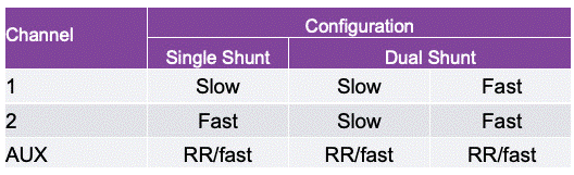為了簡化設(shè)置,監(jiān)視器的五個(gè)ADC形成三個(gè)數(shù)據(jù)采集通道。每個(gè)通道可以配置為兩種速度之一,具體取決于應(yīng)用,如表 1 所示。例如,兩個(gè)通道可用于監(jiān)控單個(gè)分流電阻器:一個(gè)通道用于慢速(100 ms)高精度電流、功率、電荷和能量測量;另一個(gè)用于快速(782 μs)電流快照,與電池組電壓測量同步,用于阻抗跟蹤或預(yù)充電測量;蛘,通過兩個(gè)獨(dú)立通道監(jiān)控的兩個(gè)不同尺寸的分流電阻(如圖2所示),允許用戶平衡每個(gè)分流器的精度和功率損耗。同時(shí),第三個(gè)輔助通道可以對可選緩沖輸入進(jìn)行快速測量,也可以對兩個(gè)可配置輸入(堆棧電壓、芯片溫度、電源電壓和基準(zhǔn)電壓)進(jìn)行自動循環(huán)(RR)測量。