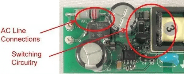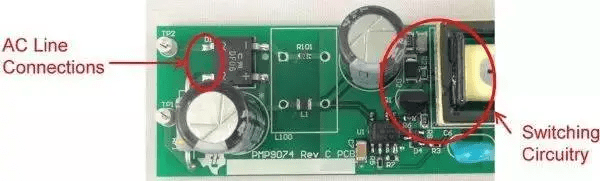 輸入連接從左側(cè)進入,到達距漏極連接1cm以內(nèi)的位置。這就是故障點,在這里FET的開關(guān)電壓波形可以繞過EMI濾波器耦合至輸入。