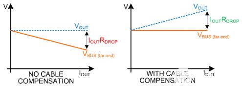 位于中控臺(tái)上或后排乘客座椅附近的 USB 端口使用長(zhǎng)電纜連接到電源轉(zhuǎn)換器的輸出。該電源轉(zhuǎn)換器存在于儀表板的信息娛樂(lè)主機(jī)中。充電時(shí),在 USB 插座上的電纜末端觀察到壓降,因?yàn)檫@些電纜的電阻有限。例如,輸出電壓為5V,電流為5A,在100m?電纜在插座處具有 500mV 壓降。這違反了USB (3.0)標(biāo)準(zhǔn),該標(biāo)準(zhǔn)要求連接器電壓在±250mV范圍內(nèi)(±5%)。在負(fù)載瞬變期間以及器件連接或斷開(kāi)時(shí),插座上觀察到較大的電壓擺幅。通過(guò)實(shí)施壓降補(bǔ)償可以解決這個(gè)問(wèn)題,其中功率轉(zhuǎn)換器的輸出電壓與輸出電流成比例增加,如圖4所示?刂品桨赴ㄕ答,其中電壓增加以增加電流,這經(jīng)常出現(xiàn)穩(wěn)定性挑戰(zhàn)。這種方法用于補(bǔ)償由于PCB走線和連接器的電阻引起的壓降。這在設(shè)備端提供了準(zhǔn)確的充電電壓。此外,增加一個(gè)檢測(cè)電阻以檢測(cè)輸出電流會(huì)產(chǎn)生額外的壓降和功率損耗。此外,壓降補(bǔ)償在負(fù)載瞬變期間引入較大的壓降。長(zhǎng)電源線除了電阻外,還包括電感,這會(huì)導(dǎo)致快速負(fù)載瞬變期間的壓降很大。