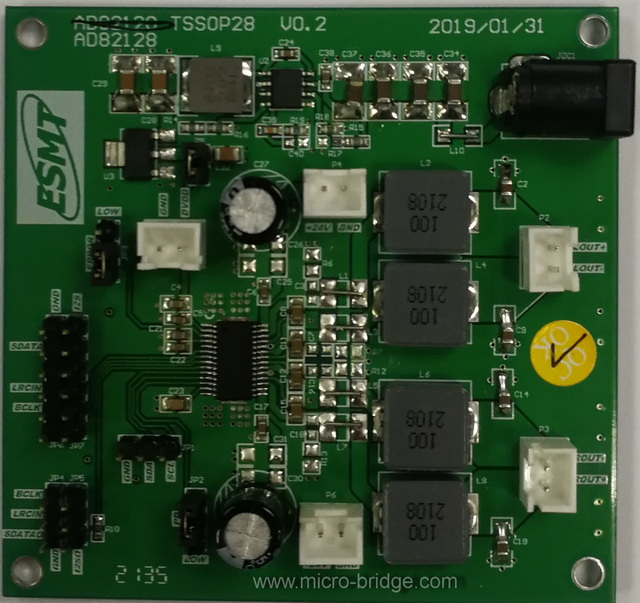 AD82128 is a digital audio amplifier capable of driving 25W (BTL) each to a pair of 8Ω load speaker and 50W (PBTL) to a 4Ω load speaker operating at 24V supply without external heat-sink or fan requirement with play music. AD82128 provides advanced audio processing functions, such as volume control, 32 EQ bands, audio mixing, 3D surround sound and Dynamic Range Control (DRC). These are fully programmable via a simple I2C control interface. Robust protection circuits are provided to protect AD82128 from damage due to accidental erroneous operating condition. The full digital circuit design of AD82128 is more tolerant to noise and PVT (Process, Voltage, and Temperature) variation than the analog class-AB or class-D audio amplifier counterpart implemented by analog circuit design. AD82128 is pop free during instantaneous power on/off or mute/shut down switching because of its robust built-in anti-pop circuit.