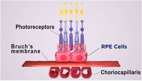 外層血—視網膜外屏障由視網膜色素上皮(RPE)組成,視網膜色素上皮被布魯赫膜與富含血管的脈絡膜毛細血管隔開。布魯赫膜調節(jié)絨毛毛細血管和RPE之間的營養(yǎng)物質和廢物的交換。在AMD中,稱為脈絡膜小疣的脂蛋白沉積物在布魯赫膜外形成,阻礙其功能。隨著時間的推移,RPE分解,導致光感受器退化和視力喪失。