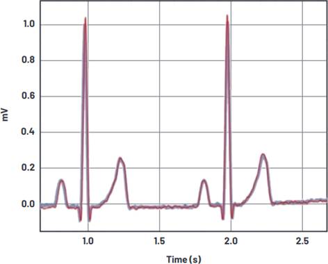 圖4顯示了兩個ECG波形。藍色波形是用高質(zhì)量的電極測量的,具有51 kΩ的串聯(lián)阻抗和47 nF電容。但是,紅色波形是用質(zhì)量差的電極測量的,具有高串聯(lián)阻抗。它具有510 kΩ接觸阻抗和4.7 nF電容。我們可以看到,ADPD4000測量兩個波形幾乎完全相同,與電極質(zhì)量無關(guān)。與市場上的其他解決方案相比,這是該前端的巨大優(yōu)勢。另一個優(yōu)點是該電路具有極高的功率效率,因為它在捕獲充電電容器上的ECG信號時不必處于活動狀態(tài)。另一個優(yōu)點是功耗為150 μW至200 μW。