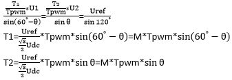 圖4為參考電壓在第一扇區(qū),有兩個非零矢量U1U2和零矢量合成,當參考電壓進入下一個扇區(qū),采用新的相鄰兩個矢量與零矢量進行合成;谑噶亢铣梢(guī)則,在符合T1+T2 《= Tpwm條件下,并要求任意角度下V1和V2都能合成出的矢量,所以Uref_max=√3/2 Udc。調(diào)制度M=Uref/(Uref_max)=Uref/(√3/2 Udc)。