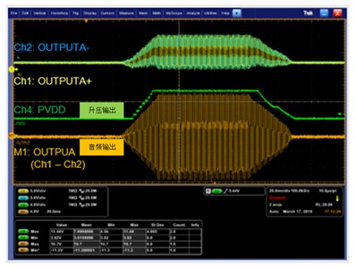 圖7. TAS5825P 實(shí)現(xiàn)實(shí)現(xiàn)動(dòng)態(tài)調(diào)壓音頻功放的實(shí)驗(yàn)波形