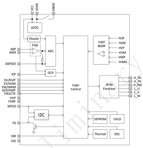 FT8215Q內(nèi)置多個(gè)功能模塊:系統(tǒng)時(shí)鐘(OSC)、ADC采樣、I2C通信、5V穩(wěn)壓(LDO)、電流采樣(VScaler)、過流保護(hù)(Over Current)、過溫保護(hù)(Thermal)等模塊。外置引腳有U/V/W驅(qū)動(dòng)輸出、SPEED/APSEED調(diào)速、FG輸出、正反轉(zhuǎn)DIR控制等。