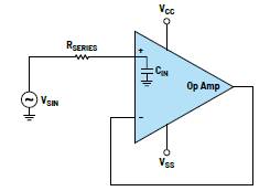 圖1.在運(yùn)算放大器輸入端增加串聯(lián)電阻之后,可以測(cè)量運(yùn)算放大器的輸入電容。