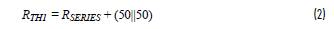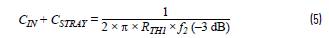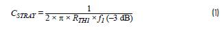 f1(–3dB)是使用網(wǎng)絡(luò)分析儀,在不帶運(yùn)算放大器時(shí)測(cè)量得出的–3dB轉(zhuǎn)角頻率,RTH1與插入的串聯(lián)電阻(RSERIES)、輸入端接電阻(50Ω)和功率分配器(Thévenin同等產(chǎn)品)的50Ω源阻抗成函數(shù)關(guān)系:
