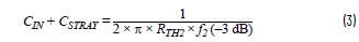 其中,f2(–3dB)是使用網(wǎng)絡(luò)分析儀,在帶有運(yùn)算放大器時(shí)測(cè)量得出的–3dB轉(zhuǎn)角頻率,RTH2與插入的串聯(lián)電阻、輸入端接電阻(50Ω)、功率分配器的輸出電阻(50Ω),以及運(yùn)算放大器(RCM)的共模輸入阻抗成函數(shù)關(guān)系: