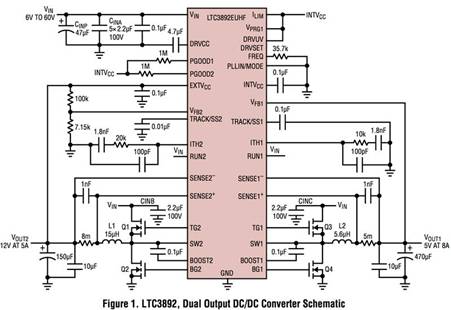 圖 1 顯示了單個(gè) LTC3892、雙輸出解決方案:在 5A 時(shí)輸出 12V,在 8A 時(shí)輸出 5V。LTC3892 控制兩個(gè)電源系,每個(gè)都有一對(duì)開關(guān) MOSFET、電感器和輸出濾波器。該電路展示了通過對(duì) V PRG1引腳進(jìn)行編程將 V OUT1 設(shè)置為固定電平的能力 。在此示意圖中,它設(shè)置為 5V 1;因此,V OUT1 直接連接到 FB1 引腳。通過將 DRVSET 引腳連接到 INTV CC引腳來選擇標(biāo)準(zhǔn)柵極驅(qū)動(dòng)電平 。