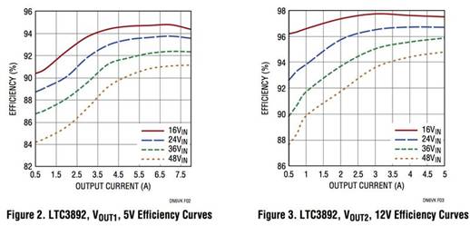 在圖 1 的解決方案中,兩個(gè)輸出的 V IN 引腳和頂部 MOSFET 的漏極連接到相同的輸入電壓 V IN。但是,如果需要,這三個(gè)端口可以連接到不同的電壓或電源。設(shè)計(jì)人員可以通過 V IN引腳對(duì) LTC3892 進(jìn)行偏置 ,并將來自不同源的電壓施加到 Q1 或 Q3 的漏極。圖 2 和圖 3 顯示了圖 1 中的轉(zhuǎn)換器在各種輸入電壓下的效率。