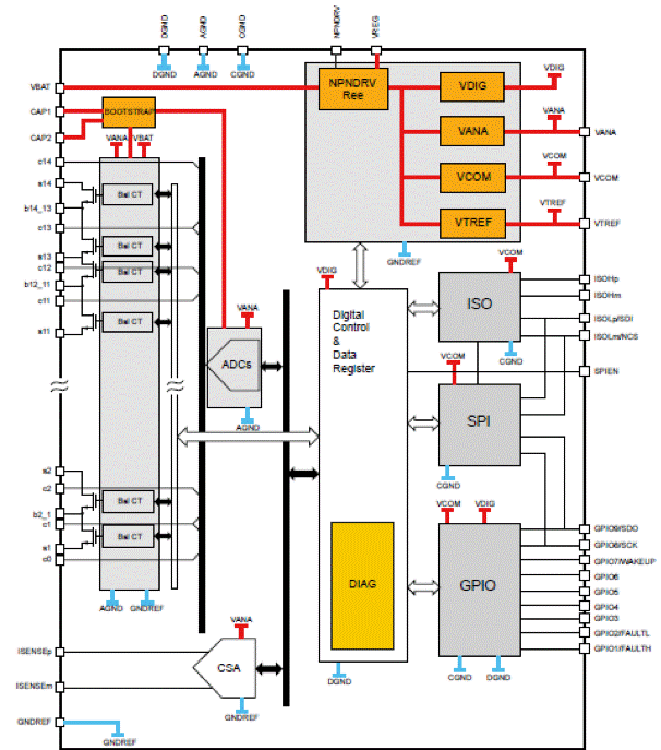 此外,器件中包含的隔離式雙向菊花鏈端口支持通過電容器和變壓器進(jìn)行隔離,并且能夠使用更高效的組件實(shí)現(xiàn)xEV動(dòng)力總成系統(tǒng)中常見的集中式或分布式架構(gòu)。在通信線路中斷的情況下,菊花鏈通信接口可配置為環(huán)形架構(gòu),允許主機(jī)與堆棧兩端的設(shè)備通信。器件中的8個(gè)GPIO或輔助輸入可執(zhí)行外部熱敏電阻測量。