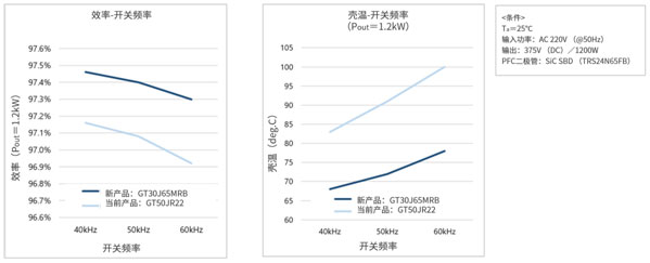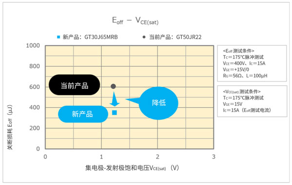 對(duì)于使用東芝當(dāng)前產(chǎn)品GT50JR22的空調(diào)PFC電路,其工作頻率低于40kHz[6]。而GT30J65MRB是東芝首款用于60kHz[6]以下PFC的IGBT,其可通過降低開關(guān)損耗(關(guān)斷損耗)來確保更高的工作頻率。