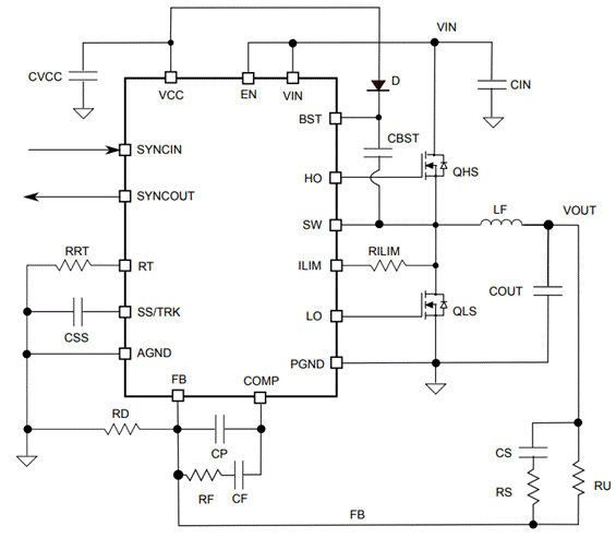 輸入級組件包括組成PI 網(wǎng)絡(luò)的大容量電容器、濾波電路(C4、C5 和 L1),以減輕高頻開關(guān)操作引起的高頻射電輻射。輸入直流總線電壓連接控制器的VIN引腳(引腳20),在路徑中有串聯(lián)電阻。VIN為控制器內(nèi)部電路供電,同時供給內(nèi)部LDO穩(wěn)壓器,以產(chǎn)生 7.5V的Vcc 輸出電壓。VIN還是內(nèi)部柵極驅(qū)動器的電源。在引腳 20上需要連接一個小的MLCC 電容。通過輸入分壓電路在使能引腳(引腳 1)上施加偏壓,以便在 40V時啟用控制器,避免電池深度放電。一旦EN/UVLO引腳電壓超過1.2 V 典型值,軟啟動階段就會開始,SS/TRK 引腳電壓上升,控制器啟動。為了在40V最小輸入電壓時控制器能夠運行,電阻器 R1 和 R6的阻值分別選擇100K 和 4.7K。為確?刂苹芈方^對穩(wěn)定,并不受電容器類型的影響,控制器實現(xiàn)了 III 型補償器,為開發(fā)者提供了兩個零點和三個極點,確保相位裕度足以提高階躍負載的性能。