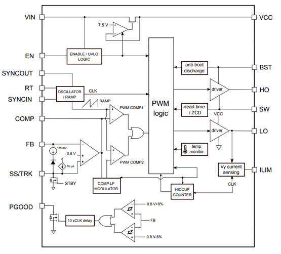 ✦ 輸出電壓監(jiān)控電路:如果輸出電壓測量值在目標值的87%以上,就會發(fā)送PGOOD 電源良好信號。