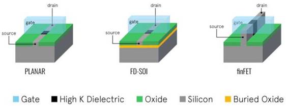 目前正在生產(chǎn)的三種半導體工藝技術(shù),包括用于平面體CMOS硅、用于低噪聲和快速操作的全空乏絕緣上覆硅(FD-SOI) 以及用于高性能的鰭式場效晶體管(FinFET)
