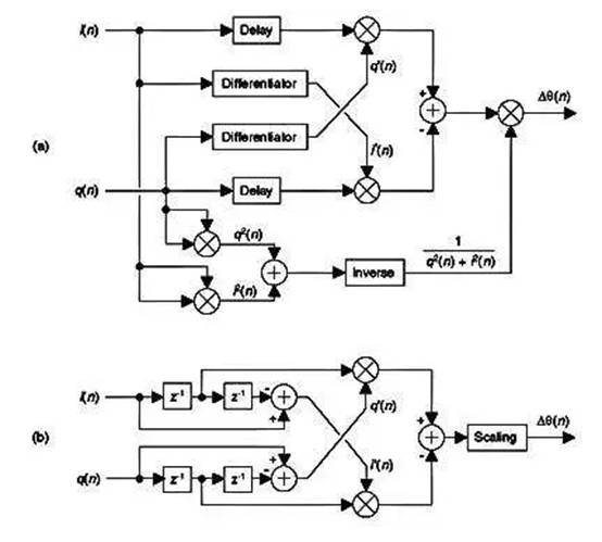 圖 13–61(a) 顯示了該算法的實現(xiàn),其中i ( n ) 和q ( n ) 的導(dǎo)數(shù)分別為i’( n ) 和q ’( n )。Δφ( n ) 輸出序列用于等式。(13–111) 計算瞬時頻率。