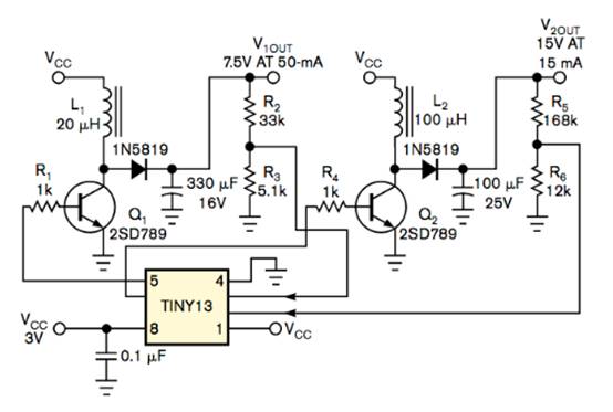 圖 2 Atmel Tiny13 AVR 微控制器使用其內部 ADC 和 PWM 調節(jié)兩個升壓直流/直流轉換器輸出。