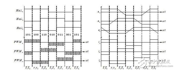 圖2: Hall狀態(tài)與PWM、三相反電動(dòng)勢(shì)、三相電流的對(duì)應(yīng)關(guān)系