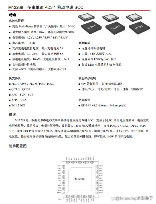 M12269 M12269是一款面向3-8串電芯大功率移動(dòng)電源應(yīng)用的專用SOC,集成了同步升降壓電壓變換器、電池充放 電管理模塊、顯示模塊、電量計(jì)算模塊,提供最大 140W 輸入/輸出功率,支持 PD3.1、QC3.0、AFC、FCP、 SCP、BC1.2 DCP 等主流快充協(xié)議,并提供過(guò)壓/欠壓、過(guò)充/過(guò)放、過(guò)溫等完備的保護(hù)功能。配合簡(jiǎn)單的外圍電路,即可組成大功率多口移動(dòng)電源管理方案。 QFN-48 3.3V-28V 多串升降壓大功率移動(dòng)電源 SOC