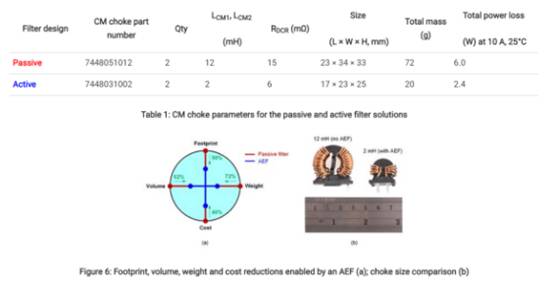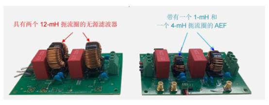 如對比圖所示,采用有源濾波器之后,共模扼流圈從兩個12mH的縮小至1nH和4nH。
