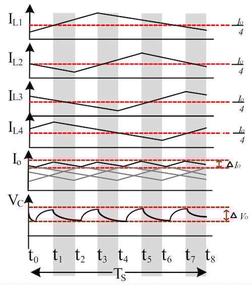 類似的事情發(fā)生在輸出端。在上一篇文章中,我們查看了一篇關(guān)于為EV 電池充電的多相降壓調(diào)節(jié)的研究論文中的原理圖和時序圖?纯赐黄撐闹械妮敵鲭娏鲌D(圖 2)。